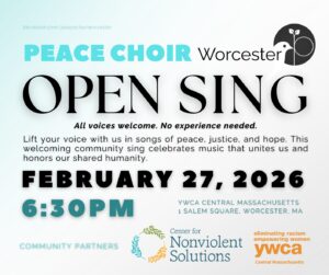 Lift your voice with others in songs of peace, justice, and hope. This welcoming community sing celebrates music that unites us and honors our shared humanity. All voices welcome. No experience needed. Hosted by the Center for Nonviolent Solutions and the YWCA of Central Mass.